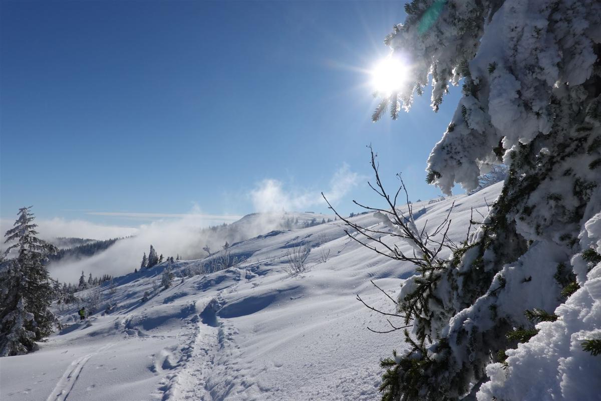 An der Lichtung beim Häuslebauer erwartet uns eine schöne Überraschung. Der Besitzer verköstigt uns mit selbst gemachtem Punsch. Alternativ stehen Getränke im Selbstbedienungskühlschrank bereit. Auf den Bänken genießen wir die Paradesicht zum Baldenweger Buck, einem Nebengipfel des Feldbergs, unser übernächstes Zwischenziel. Am Wanderparkplatz Rinken bekommen wir zuvor noch reichlich Verpflegung serviert. Frische Brezeln, Hefezopf, Kaffee, Tee und Obst machen uns fit für den Aufstieg zum höchsten Schwarzwälder Gipfel. Bei der Baldenweger Hütte schweift der Blick zur Schwäbischen Alb und in Richtung Hegau. Wir steuern nun in die Mulde unter dem Baldenweger Buck, Tännlefriedhof genannt. Hier drängen sich vom Wind verformte Nadelbäume, die im Winter eine Kulisse wie aus dem Bilderbuch abgeben. Aber Vorsicht: Oberhalb hat sich vor zwei Wochen eine Lawine gelöst, die Spuren sind noch deutlich sichtbar. Insgesamt ist das Lawinenrisiko im Schwarzwald nicht mit jenem in den Alpen zu vergleichen. Dennoch, ausschließen lässt sich das Risiko natürlich auch hier nicht. Viel gefährlicher ist jedoch der oft vorhandene Nebel auf dem weitläufigen Gipfelplateau des Feldbergs. Bei Sturm und Schneefall kommt es hier nicht selten zum berüchtigten Whiteout. Dann verschwimmen optisch Himmel und Erde, die Orientierung wird äußerst anspruchsvoll, selbst wenn man heute auf jedem Smartphone eine GPS-App findet. Insofern kann es vor allem für Schneeschuhneulinge nicht schaden, die ersten Gehversuche gemeinsam mit einem Guide zu unternehmen.