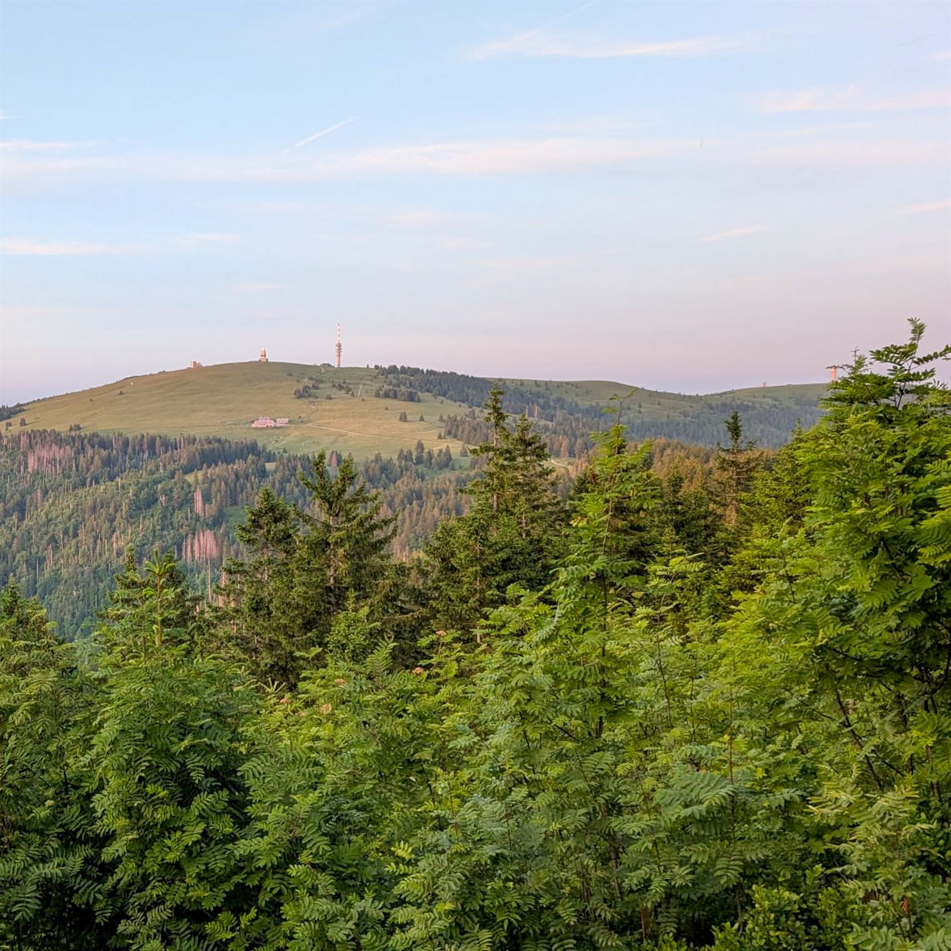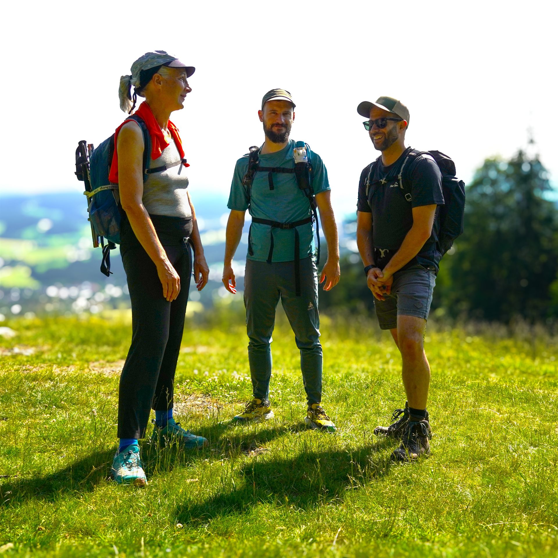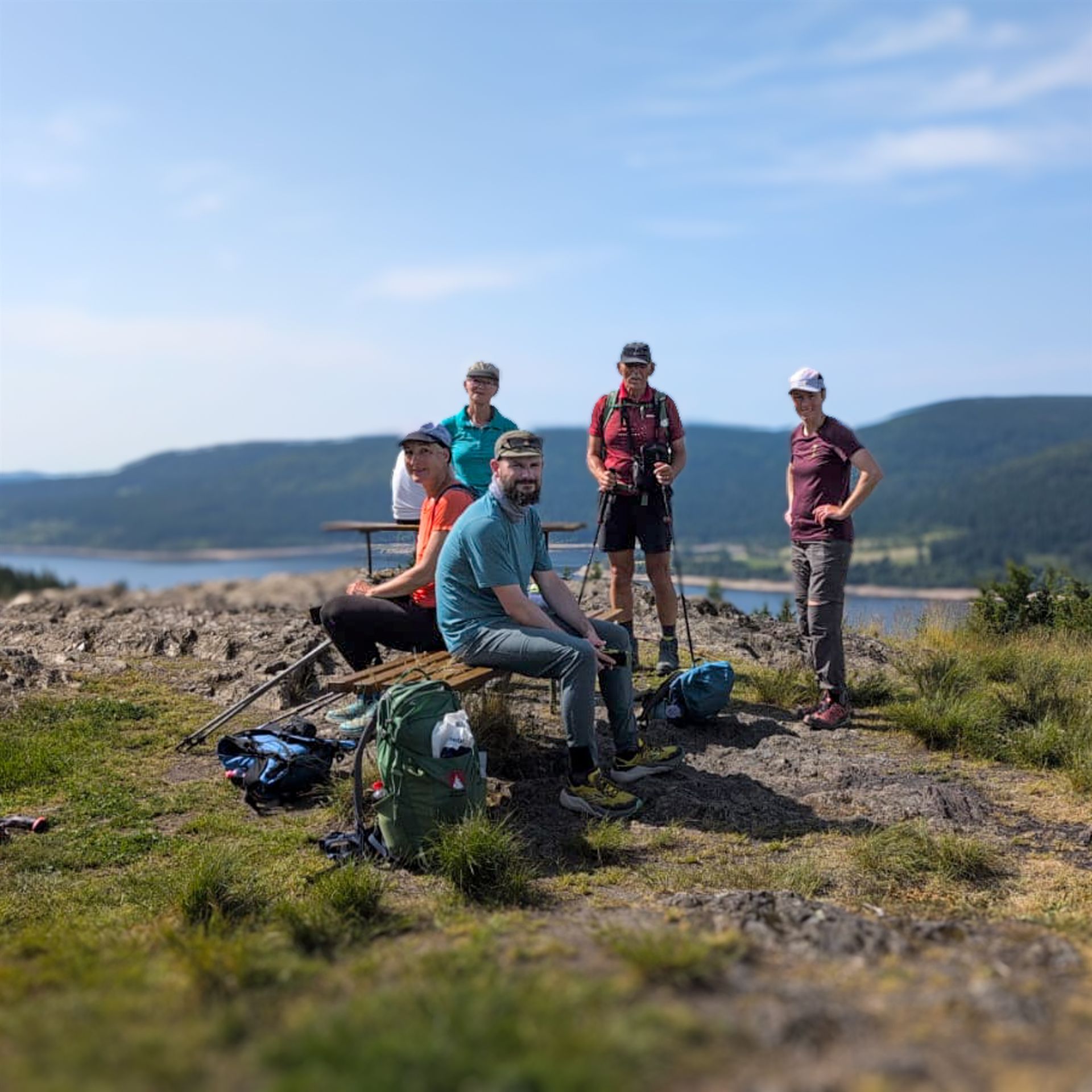 Frisch, motiviert und voller Tatendrang fiel um 9 Uhr der Startschuss. Die Wandergruppe marschierte strammen Schrittes Richtung Windeckkopf – das erste Highlight der Tour. Der Ausblick von oben? Einfach grandios! Auf der Höhe und im Schatten von Fichten und Tannen ging es weiter bis zur nächsten kurzen Verschnaufpause an der Grillhütte Rinken. Der nächste Abschnitt hatte es in sich: ein schweißtreibender Aufstieg mit viel Sonne auf den Feldberg-Gipfel, Baden-Württembergs höchsten Punkt.