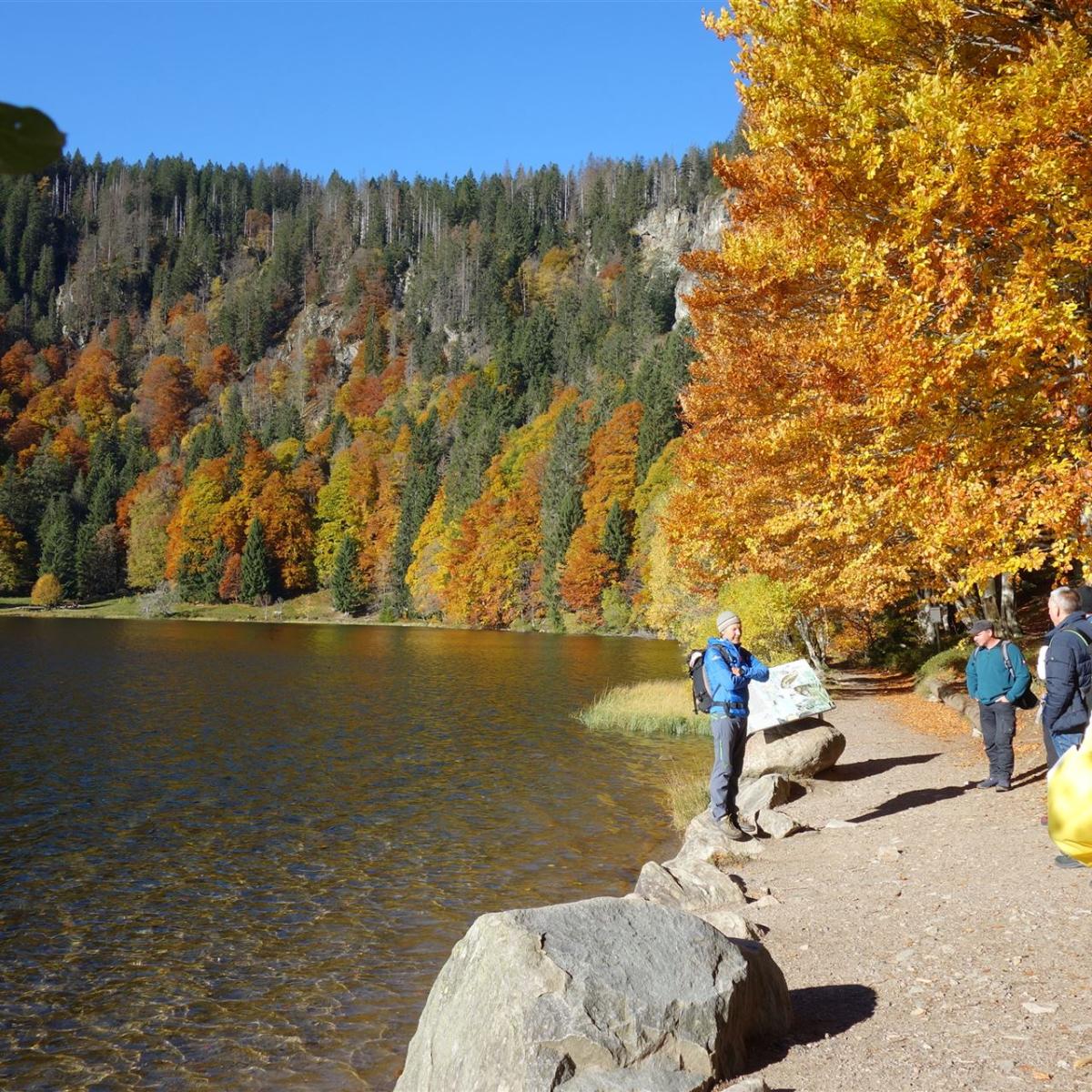 Abgesehen von den Aussichtsgipfeln gibt es so manch verträumtes Wanderziel, welches man unbedingt im Herbst besuchen sollte. Eines davon ist der beinahe kreisrunde Feldsee unterhalb des Seebuck-Gipfels. Der steinige Wanderpfad dorthin ist mit einer dicken Schicht Laub bedeckt, eine Herausforderung für die Sprunggelenke, denn allzu leicht ist man umgeknickt – feste Wanderschuhe sind im Herbst also dringend anzuraten.