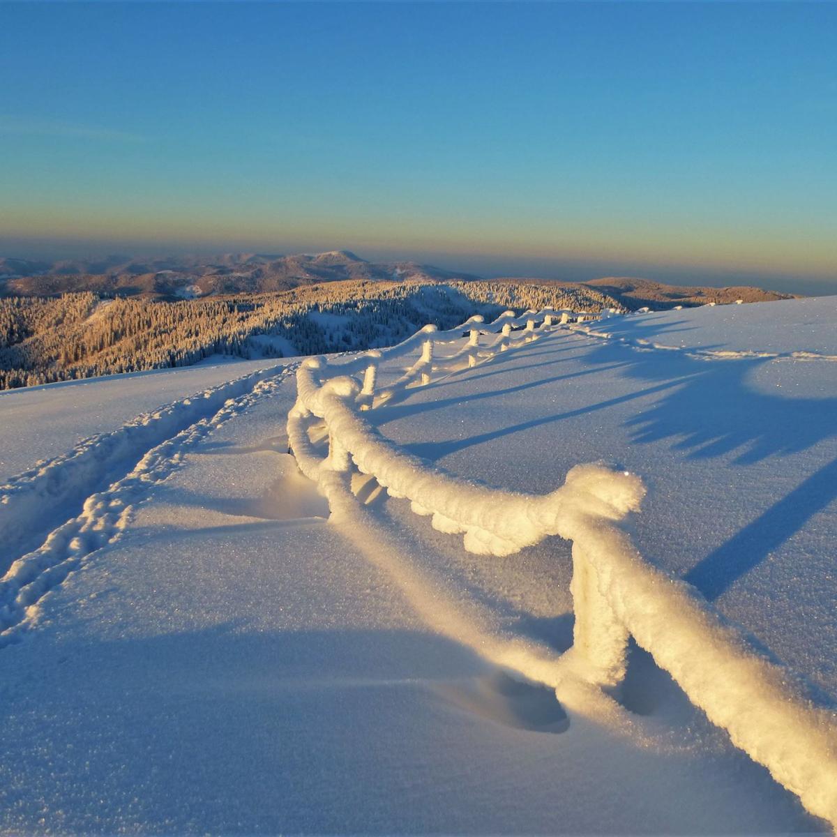 Bereits wenige Meter hinter dem Kurhaus können wir die Schneeschuhe anlegen. Das einfache Bindungssystem unserer Sportgeräte lässt sich beinahe unter jedem guten Bergschuh befestigen, sodass keine erheblichen Anschaffungskosten wie etwa beim Skifahren anstehen, eine großartige Alternative zum Pistensport. Der mit einem magentafarbenen Schneeschuhsymbol markierte Windecktrail, eine vom Naturpark Südschwarzwald ausgewiesene und auch für Anfänger geeignete Schneeschuhroute, leitet uns rasch aus Hinterzarten hinaus. Und sogleich geht es stetig bergauf. Mit dem gewohnten Zischen krallen sich die Metallschienen der Schneeschuhe in den gefrorenen Harschdeckel. Mittlerweile ist es hell geworden und die ersten Sonnenstrahlen erwärmen die hohen Schwarzwaldgipfel. Auch unsere Körper laufen nun auf Betriebstemperatur. Vom 1200 Meter hohen Windeck genießen wir eine erste herrliche Sicht über unseren Startort, hinüber nach Breitnau und zur Weißtannenhöhe.