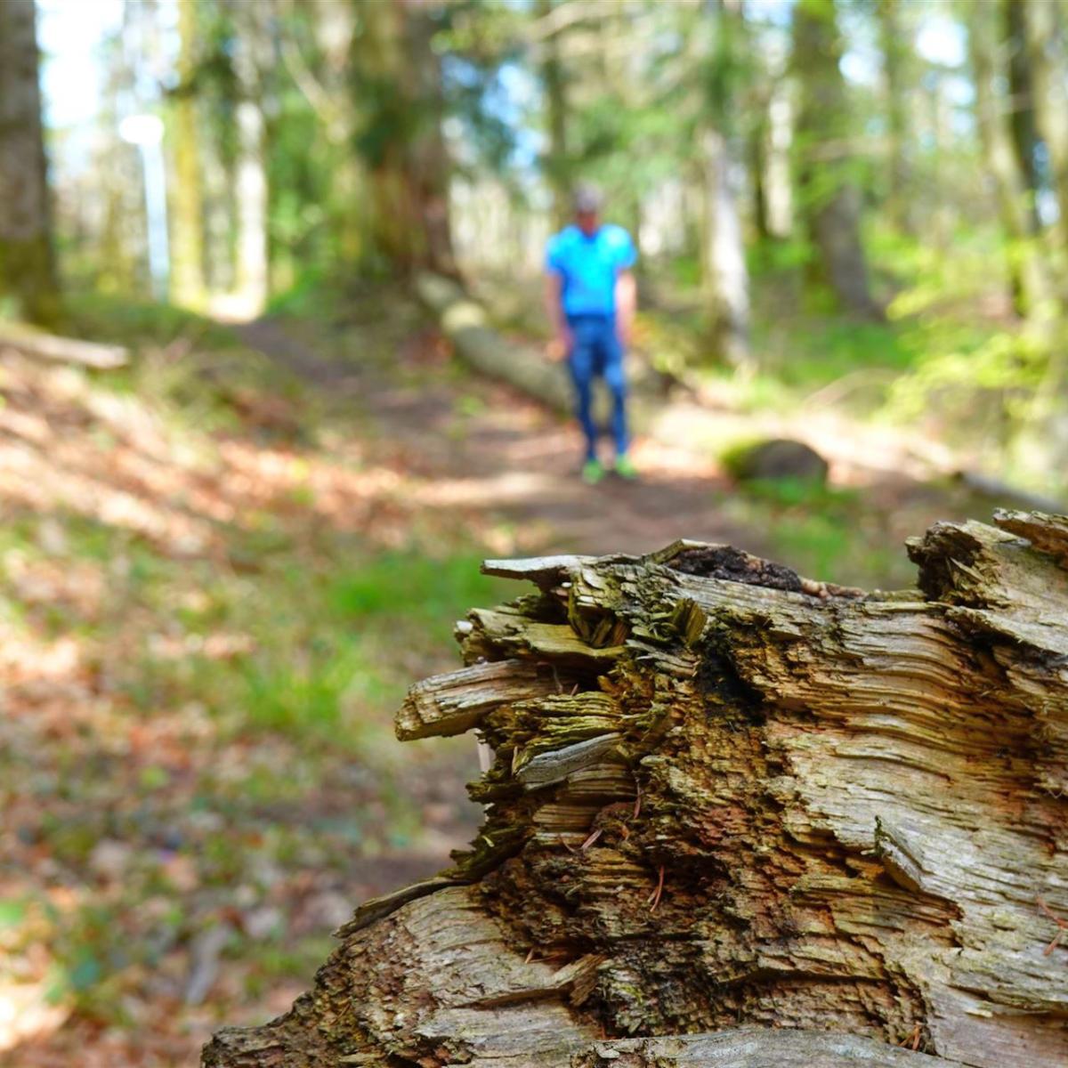 Nach Überquerung der B500 erreiche ich den Westweg und folge kurzzeitig auch der roten Raute auf weißem Grund. Vom Staatsberg schweift der Blick über Furtwangen und die Umgebung. Auch der Feldberg ist zu sehen. Nur 40 km wären es nach Hause, aber ich bleibe standhaft. Der längste Abstieg der Tour beginnt in Richtung Gütenbach. Anschließend folgt ein attraktiveres Wegstück: Durch die Teichschlucht leitet ein schöner Wanderpfad.