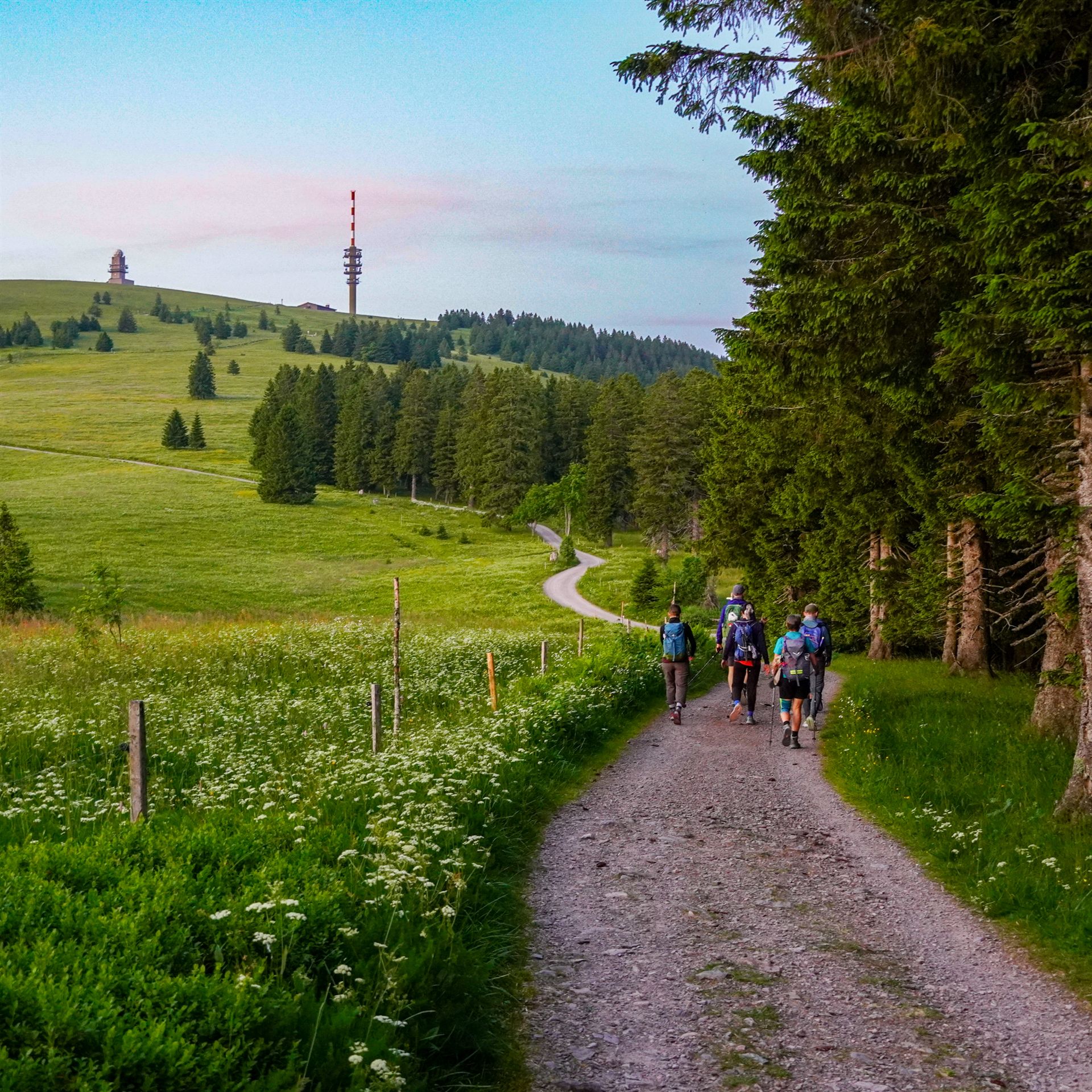 Frisch, motiviert und voller Tatendrang fiel um 9 Uhr der Startschuss. Die Wandergruppe marschierte strammen Schrittes Richtung Windeckkopf – das erste Highlight der Tour. Der Ausblick von oben? Einfach grandios! Auf der Höhe und im Schatten von Fichten und Tannen ging es weiter bis zur nächsten kurzen Verschnaufpause an der Grillhütte Rinken. Der nächste Abschnitt hatte es in sich: ein schweißtreibender Aufstieg mit viel Sonne auf den Feldberg-Gipfel, Baden-Württembergs höchsten Punkt.