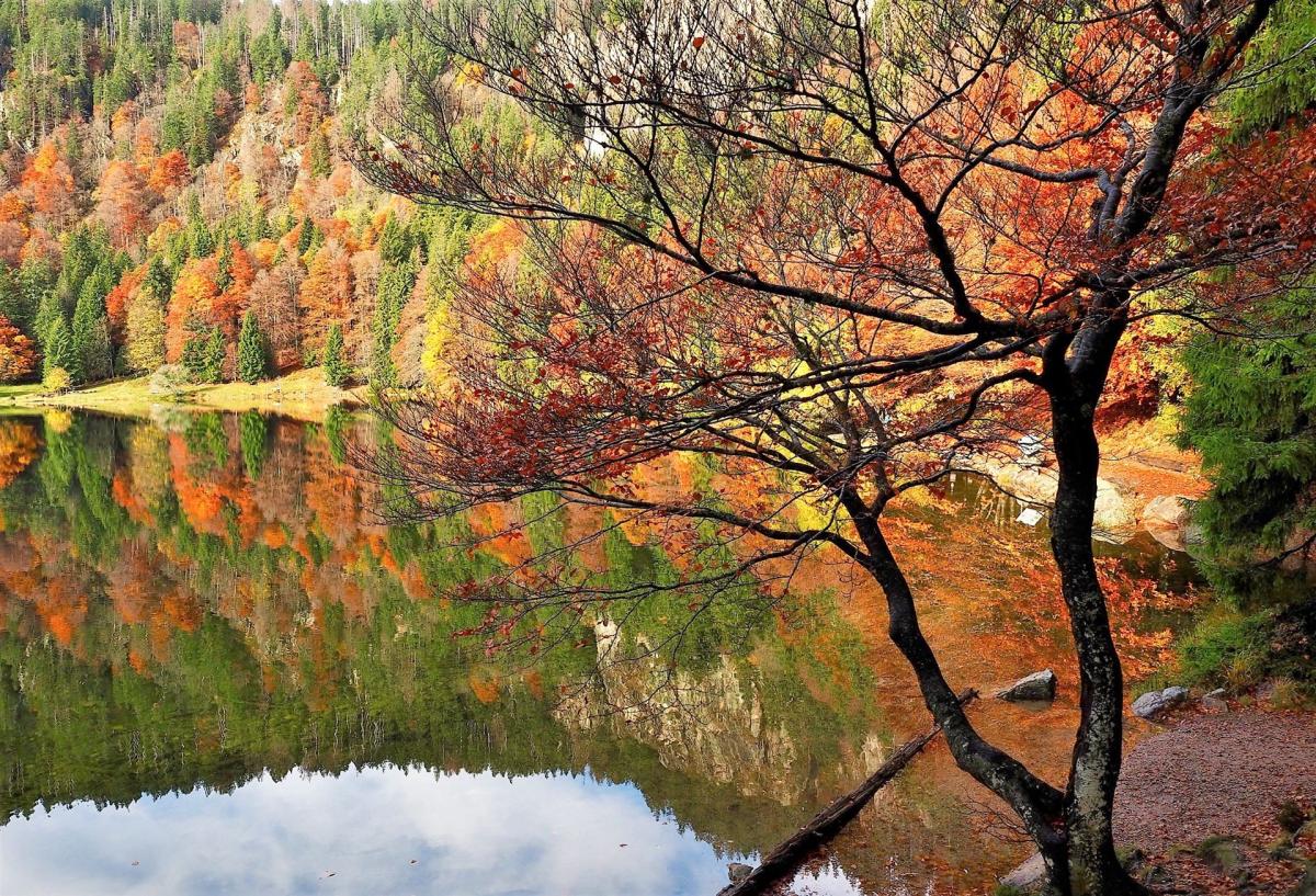 Während des Abstiegs auf dem Felsenweg umgibt mich der charakteristische Herbstgeruch. Das Wandern wird zum Genuss für alle Sinne. Dennoch ist auf dem feuchten Geröll und dem glitschigen Laub Konzentration gefordert. Bald ist der Feldsee erreicht. Das dunkle Wasser in diesem tiefsten aller Karseen im Schwarzwald erinnert an die schottischen Highlands mit ihren sagenumwobenen Lochs, Glens und Bens. Auch hier bei uns waren es eiszeitliche Gletschermassen, die sich tief ins Gestein gegraben und eine beeindruckende Landschaft geformt haben.